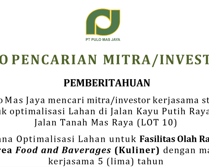 Bergabunglah dengan PT PULO MAS JAYA dalam sebuah kesempatan bisnis inovatif dan menguntungkan! Kami mengundang investor untuk menjalin kemitraan strategis dalam pemberian hak nama eksklusif (Naming Rights) untuk Kawasan Jakarta Internasional Equestrian Pulomas Park. Dapatkan hak istimewa untuk meningkatkan visibilitas dan citra perusahaan Anda di salah satu kawasan prestisius diSelengkapnya